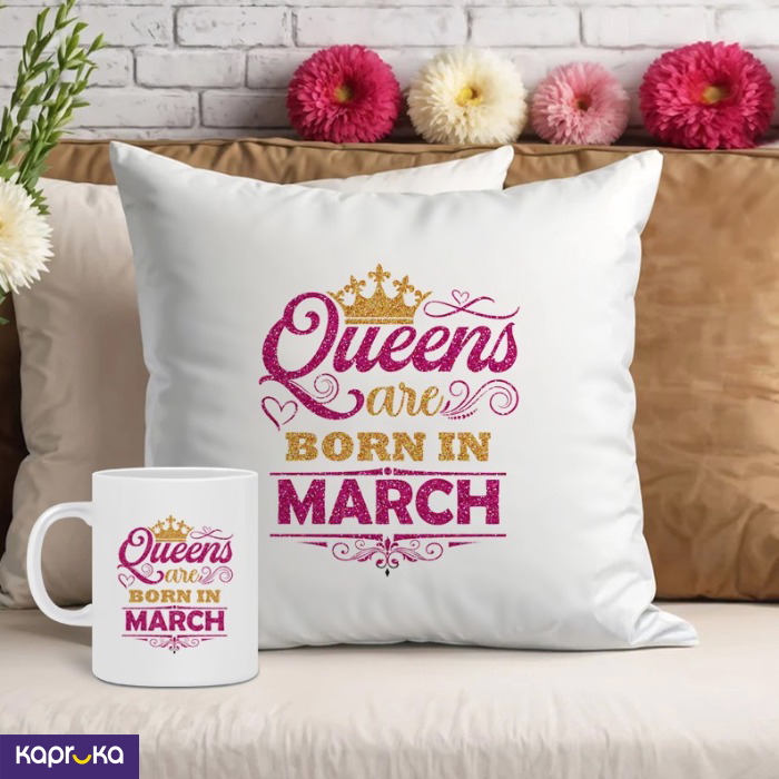 Celebrate the March queen in your life with this stylish and empowering Queens Are Born in March matching pillow and mug set. The perfect birthday gift for women and girls born in March who love to feel special and confident.