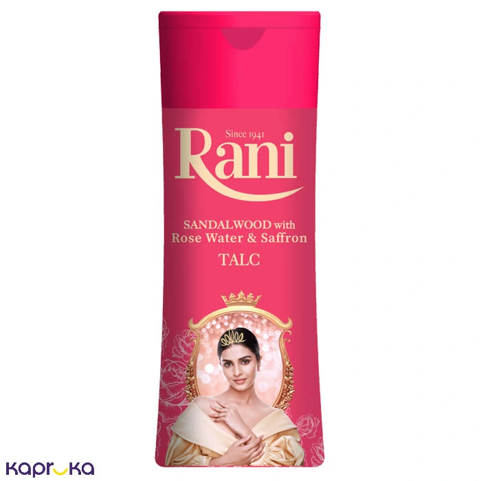 Rani Rose Talc combines the delicate fragrance of rose water with the beauty benefits of saffron, layered over the warm base of sandalwood.`