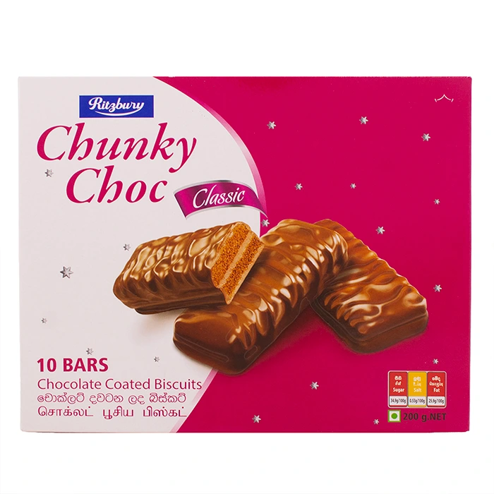 Satisfy your chocolate cravings with Ritzbury Chunky-Choc biscuits. This treat features a creamy center between two crispy biscuits, all wrapped in rich milk chocolate. Perfect for choco lovers!