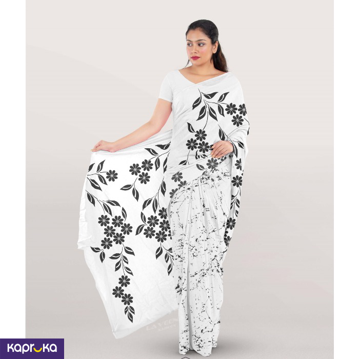 රෙදි: කපු වොයිල් අතින් මුද්රණය කර ඇත මැහුම් නොකළ බ්ලවුස් කැබැල්ලක් සමඟ බ්ලවුස් වර්ණය: සුදු සාරි වර්ණය: කළු සුදු 100% සහතික කළ නිෂ්පාදනයක්.
